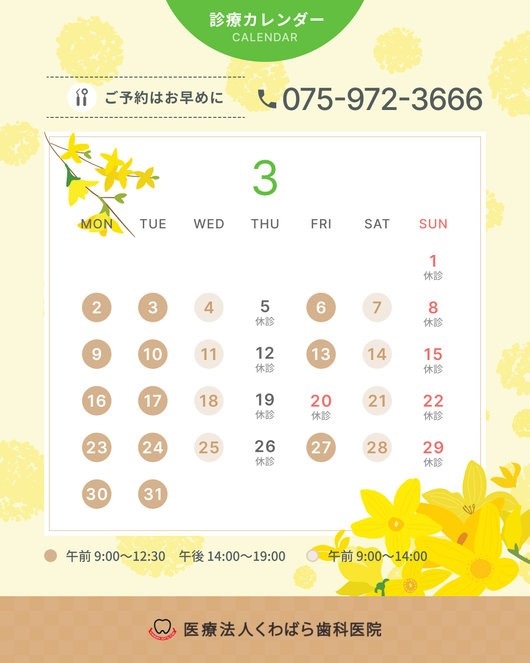 2026.02.20 お知らせ 3月の診療日のお知らせ こんにちは。くわばら歯科医院です。 来月3月の診療日をご案内いたします。 ご予約はWebサイト・お電話でお願いいたします。 前の記事 一覧へ戻る 関連記事 2026.02.13 お知らせ 【2月更新】インプラント症例を更新いたしました 2026.01.27 お知らせ 2月の診療日のお知らせ 2026.01.20 お知らせ 【1月更新】インプラント症例を更新いたしました